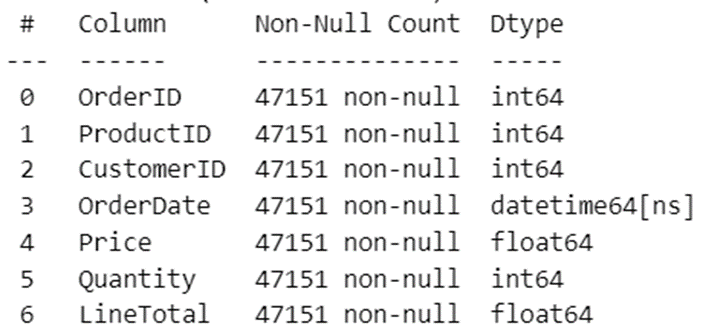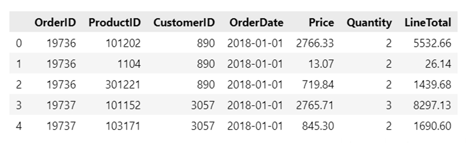 dfOrders['LineTotal'] = dfOrders['Quantity'] * dfOrders['Price']